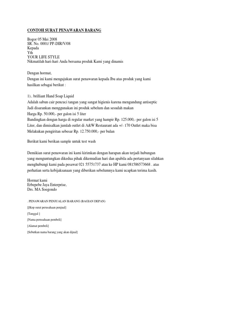 Ingin terjun sebagai pengusaha atau businessman? Sebab, negosiasi awal dilakukan melalui surat penawaran. Siapapun yang ingin sukses tentunya harus rajin belajar berbagai hal. 1 (satu) berkas hal : Daftar harga barang yang dibuat secara tertulis di dalam sebuah surat penawaran bisa menjadi modal kuat bagi konsumen untuk mendapatkan penawaran harga. Nama (kode) produk beserta deskripsinya misal seperti apa kondisi produk tersebut. Contoh surat penawaran harga barang/produk berikut ini juga ada yang menamakan sebagai surat perkenalan perusahaan. Surat penawaran harga barang serupa dengan contoh yang telah dijelaskan pada poin surat penawaran harga sebelumnya. Sebagai informasi, surat penawaran barang dan hargaadalah surat yang dibuat dan ditujukan kepada suatu perusahaan yang tujuannya yaitu untuk menawarkan suatu barang atau produk ke perusahaan tersebut beserta detail harganya. Jasa catering produk makanan dan jasa konveksi. 0 ratings0% found this document useful (0 votes). Surat permintaan penawaran harga adalah surat yang berisi pemberitahuan tertulis dari pelaksana kegiatan kepada penyedia barang dan jasa. Surat penawaran sendiri adalah surat yang dibuat dengan tujuan untuk menawarkan sesuatu, baik barang.