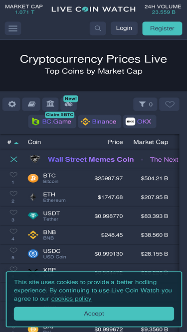 Live cryptocurrency prices and charts of top cryptocurrencies by crypto market cap. Price live chart and market data from all exchanges. We provide cryptocurrency live ranking, live cryptocurrency exchange rate, exchange cryptocurrency with best rate, live cryptocurrency news. Coinlib provides live and historic cryptocurrency prices, portfolio, alerts, news, charts and detailed coin data. Prices of cryptocurrencies are extremely volatile and may be affected by external factors such as financial, regulatory or political events.